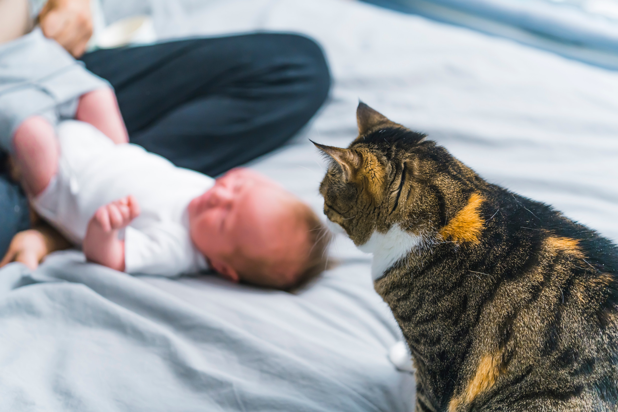 Le chat, plus territorial, est souvent perturbé par les modifications de son environnement. Il ne voit pas le bébé comme un rival, mais plutôt comme une source potentielle d’imprévisibilité.